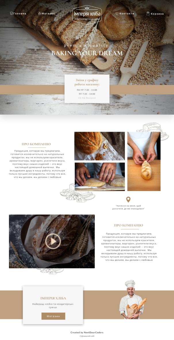У цьому проєкті ми зробили сильний акцент на привабливий та акуратний дизайн, щоб підкреслити красу та якість продукції. Ми прагнули відобразити натуральність, свіжість та високу якість виробів через вишуканий візуальний стиль сайту. Кожен елемент дизайну був тщательно продуманий, щоб створити відчуття тепла та домашнього затишку, відображаючи пристрасть до випікання та відданість традиціям хліборобства.