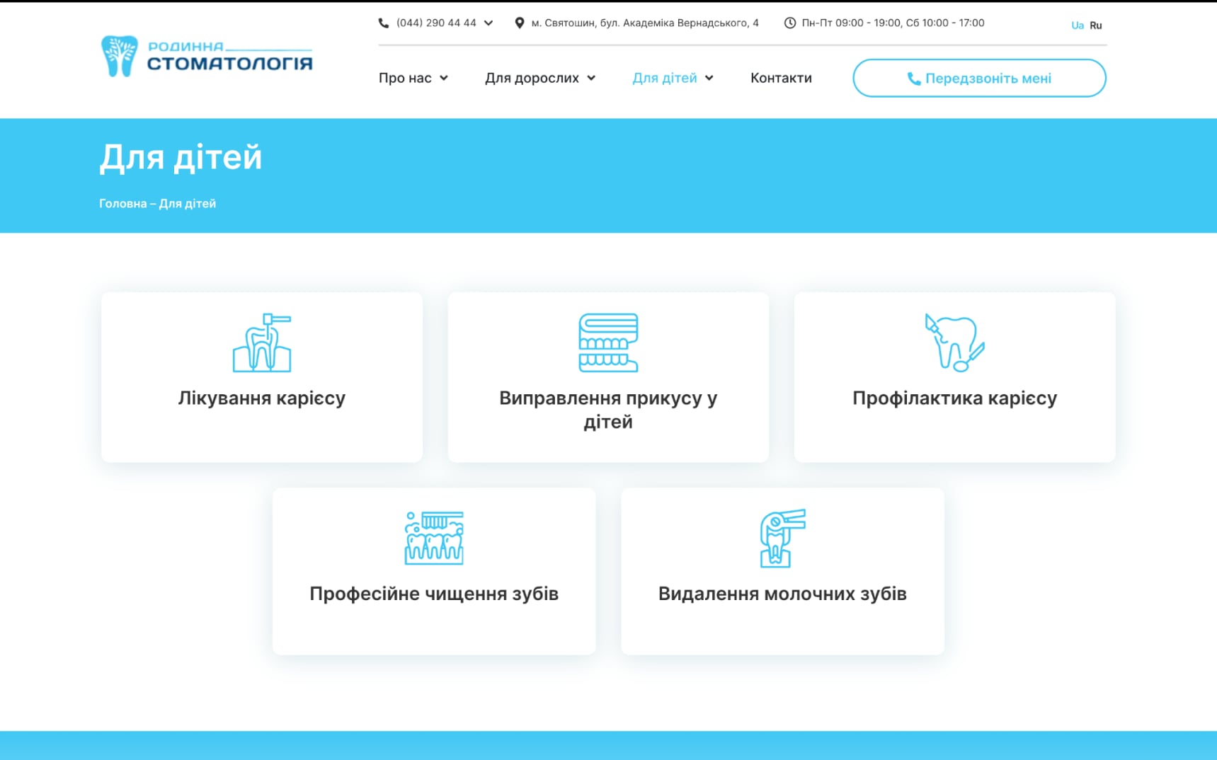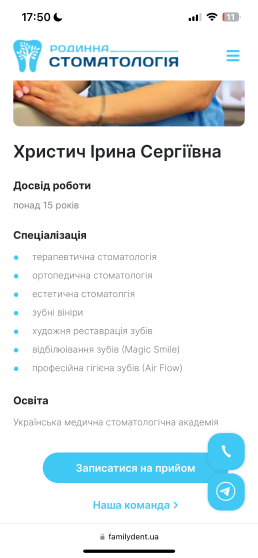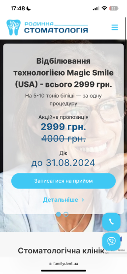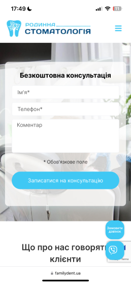 Сайт Familydent.ua розроблений з урахуванням адаптивного дизайну, що забезпечує його коректне відображення та функціонування на різних пристроях – від комп'ютерів до смартфонів та планшетів.