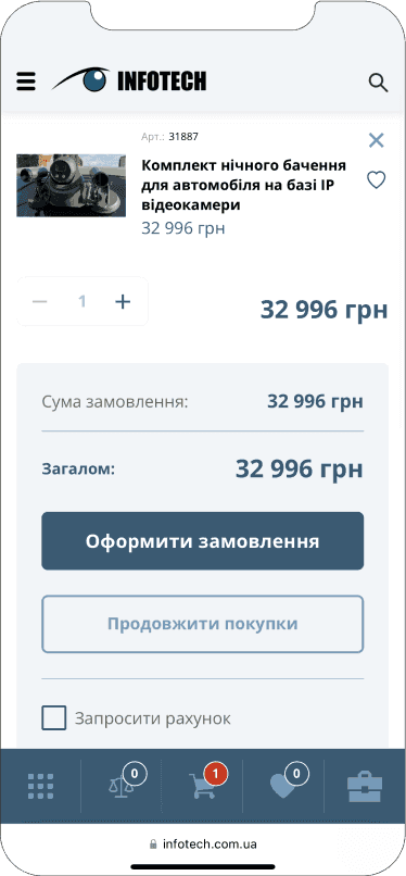 Процес додавання товарів до кошика та оформлення замовлення на сайті InfoTech максимально зручний. Користувачі можуть редагувати кількість товарів у кошику та переглядати підсумкову вартість замовлення. Це забезпечує простоту та прозорість процесу покупки.